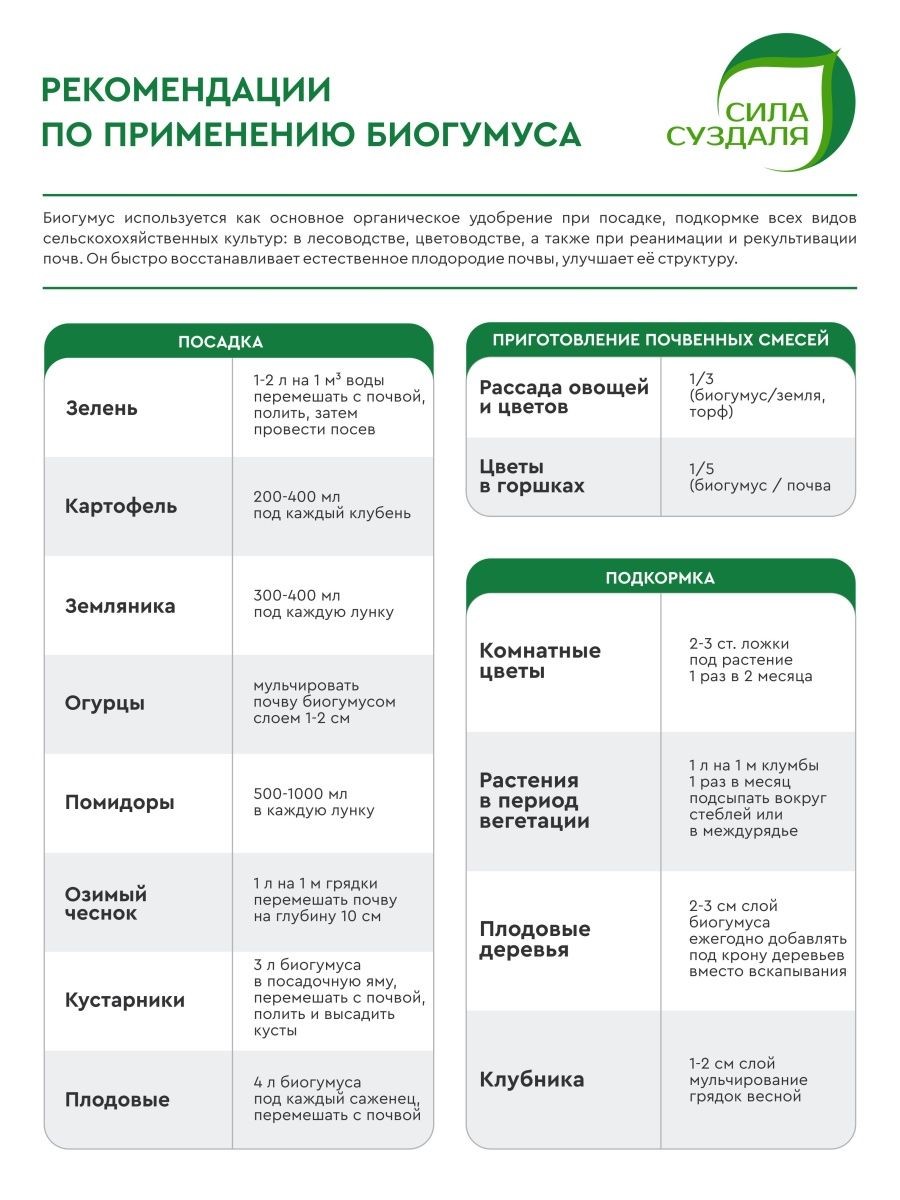 Применяется при смешивании с землей или другим субстратом. Внесение биогумуса возможно в любое время года. За счет микрофлоры и огромного количества элементов питания, находящихся в биогумусе, пролонгированный эффект длится от 3 до 5 лет после внесения.